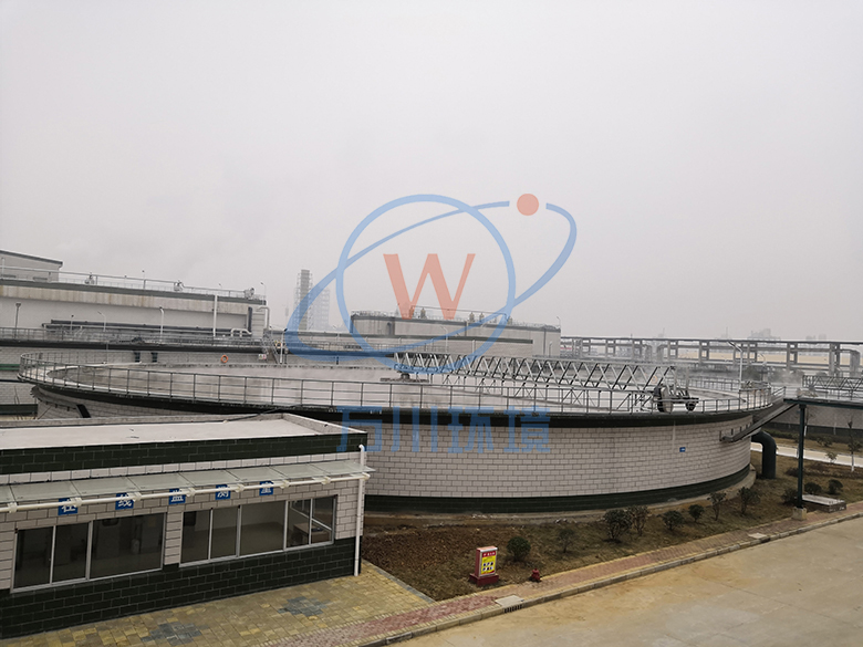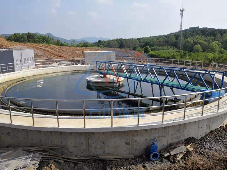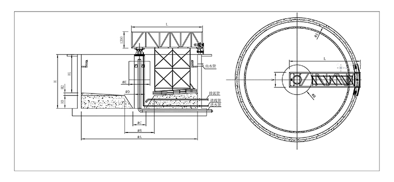 工作桥由安装在周边的驱动机构带动,绕安装在池中心支墩上的中心支座旋转。悬挂在工作桥下的刮臂拖动对数螺旋线刮泥板旋转,沉淀在池底的污泥由刮泥板收集至中央集泥坑。液面上的浮渣在浮渣刮板和周边挡渣板形成的渐缩区域内集中,由浮渣刮耙扒到集渣斗,排出池外。