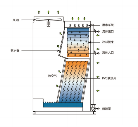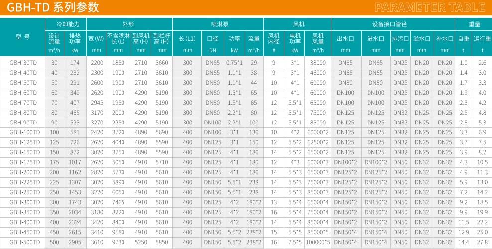 GBH-TD系列横流式冷却塔是指冷却塔当中的水从塔体上部垂直落 下,冷却塔当中空气气流水平方向通过淋水填料或者是冷却管束,气 流与水流方向正交的一种冷却方式。横流式冷却塔在塔体的单侧设 置进风格杆,在另一侧的顶部设置引风机。气流从一侧进入,从另一 侧的顶部流出。冷却介质通过冷却营束,在冷却营束中流动,介质的 热量向外传导。冷却管束外层的喷淋水吸附通过管束传递出来的热 量蒸发,形成水蒸气。蒸发的水蒸气与未饱和的空气是合,摔放到冷 却塔的外面,蒸发的水蒸气在经过收水器时被拦截,凝聚成水滴落回 到集水槽。冷即管束的主要作用是进行热传导,此运行原理的特点 能够尽可能的减少水垢的产生,在高温流体或者冷却温度差比较大 的时候表现会更加明显。