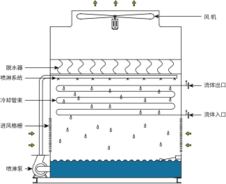 其一是内部循环 : 冷却介质经过热源换热升温后进入冷却管束, 通 过冷却管束将热量送到管束表面 , 再由流经管束的水膜蒸发与对流 换热传给空气冷却后的冷却介质再由水泵送往热源。