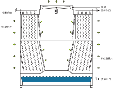 系统冷却介质进入冷却塔中 , 由喷淋系统将水喷淋而下 , 形成水汽 状态,一部分热气直接被风机带出塔外, 其余热水流经填料表面形 成水膜和空气进行热交换, 风机抽入的干冷空气经填料特殊设计的 风道与水流充分接触, 将热量快速带走, 水迂回流出填料至底部集 水盆的过程中 , 经过了若干次新空气与水的热交换, 回到集水盆的 水温度大大降低, 满足系统正常工作的水温要求。